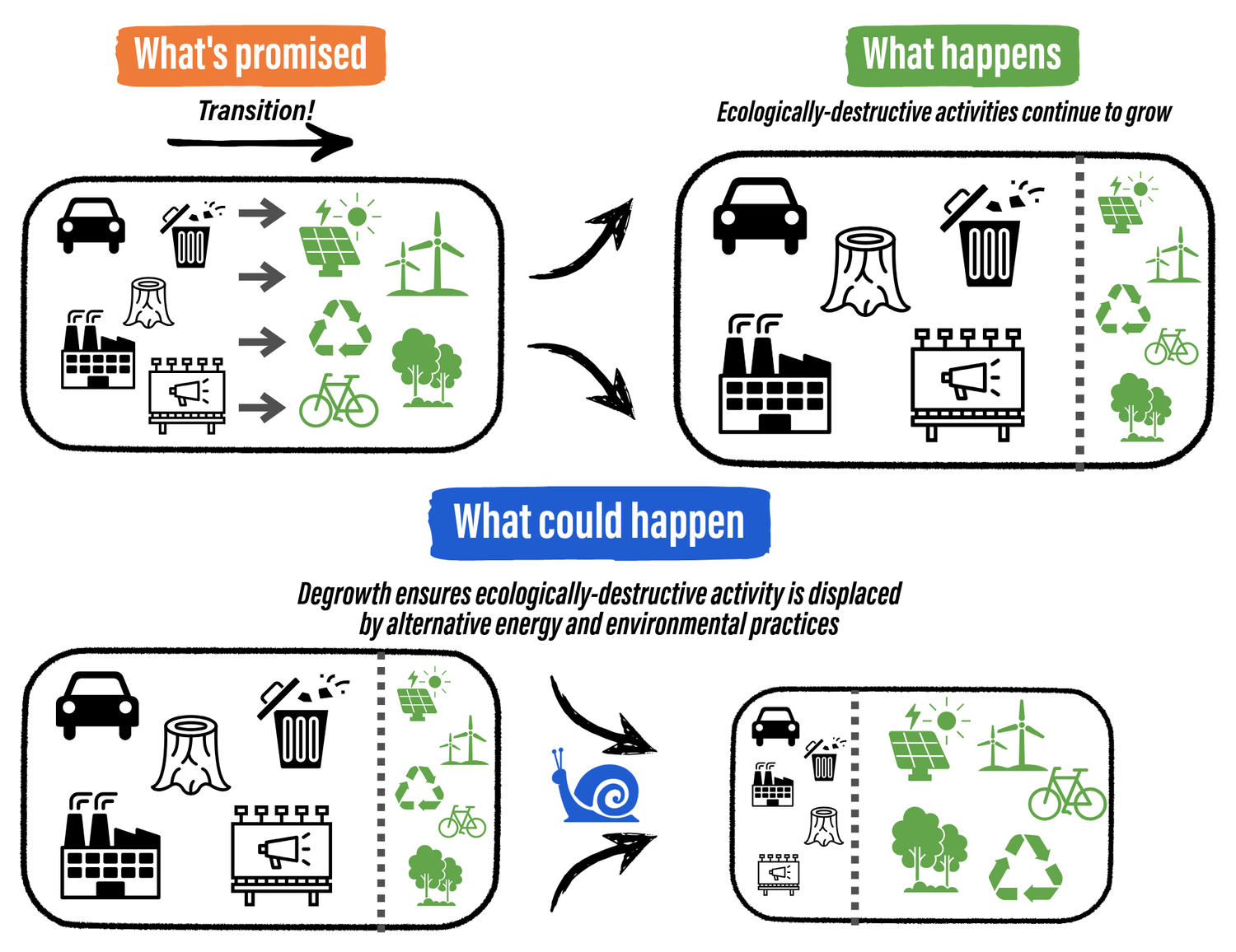 At the same time, continuing to embrace and discuss degrowth principles with your communityspreads awareness, deepens knowledge and expands the possibilities of what we can achieve. The more familiar people are with these ideas, the less radical they will seem, and the more politically feasible they will become.